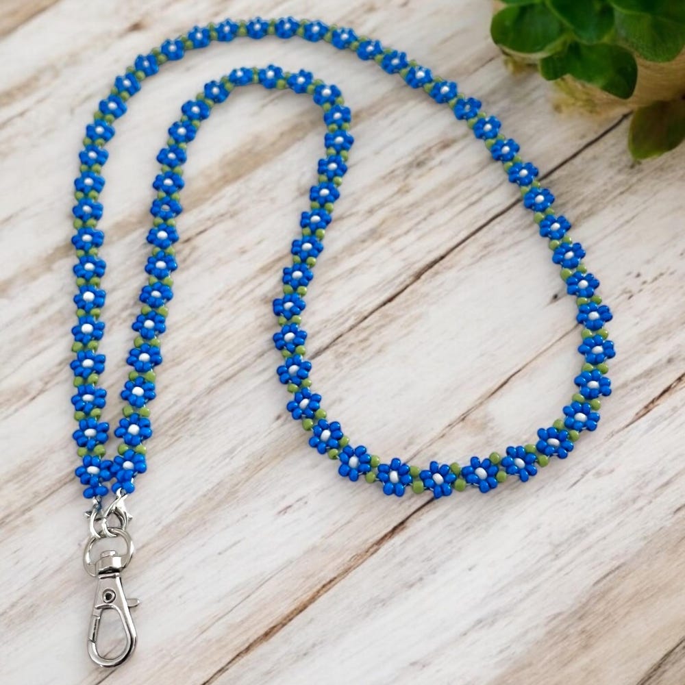Blue Lanyard Daisy Chain ID Badge Holder for Camp Counsellor Necklace Accessory for Nametag or Keys Beaded Flower Lanyard for Lifeguard