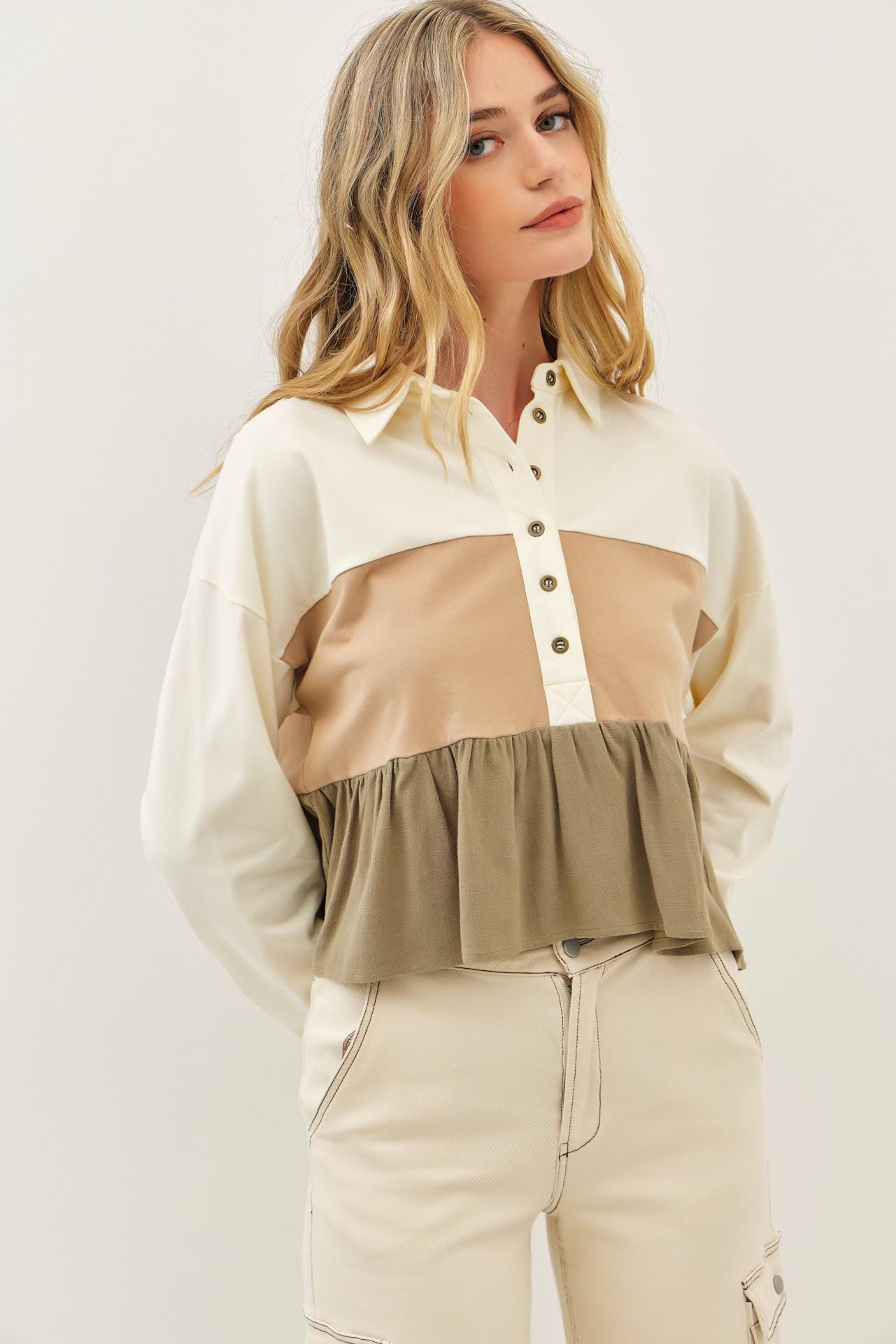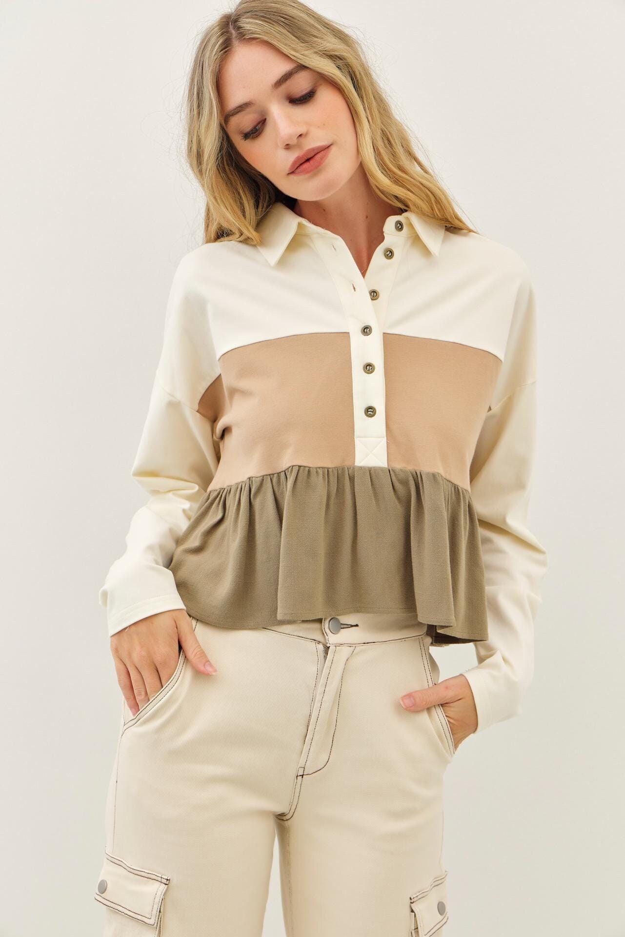 Designed with a gently flared fit, layered ruffle detail, and a relaxed half button-down neckline, it’s the perfect blend of casual and elevated. Whether you’re dressing it down with jeans or styling it with boots and accessories, this top adds effortless texture and charm to your day.